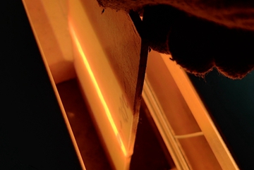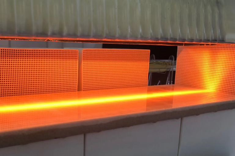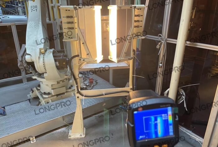在待折彎的熱塑性預(yù)浸料板上進(jìn)行紅外線(xiàn)快速預(yù)熱軟化,雙面加熱,以達(dá)到折彎所需工藝要求。利用線(xiàn)型聚焦加熱器(加熱器聚集成一條高溫加熱線(xiàn))的低能耗,高光強(qiáng),穿透力強(qiáng),控制簡(jiǎn)單等特點(diǎn),通過(guò)上下布置,快速精準(zhǔn)軟化所需的狹長(zhǎng)區(qū)域,尤其帶有厚度的預(yù)浸料折彎加工。